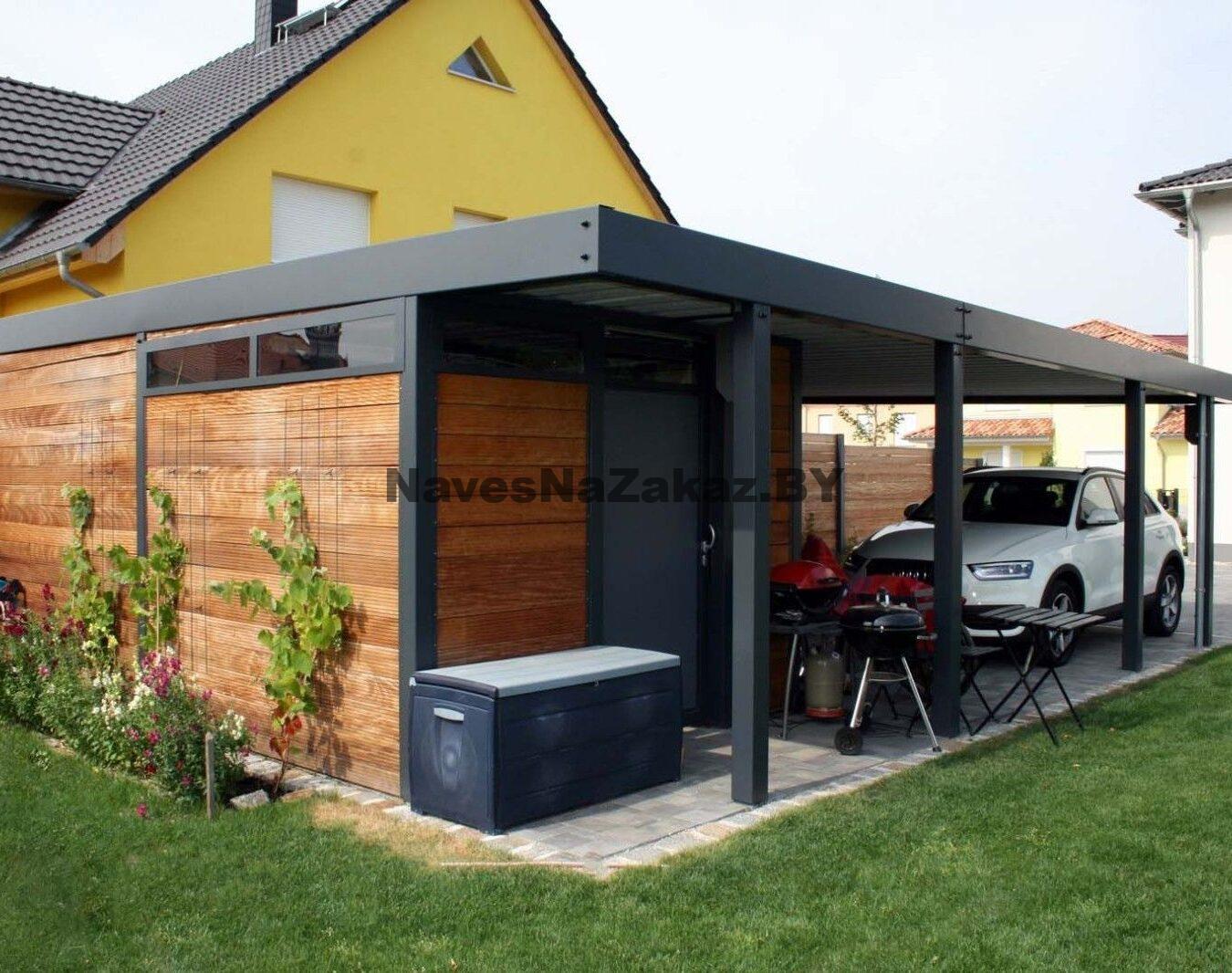 Навес для машины в современном стиле с хозблоком